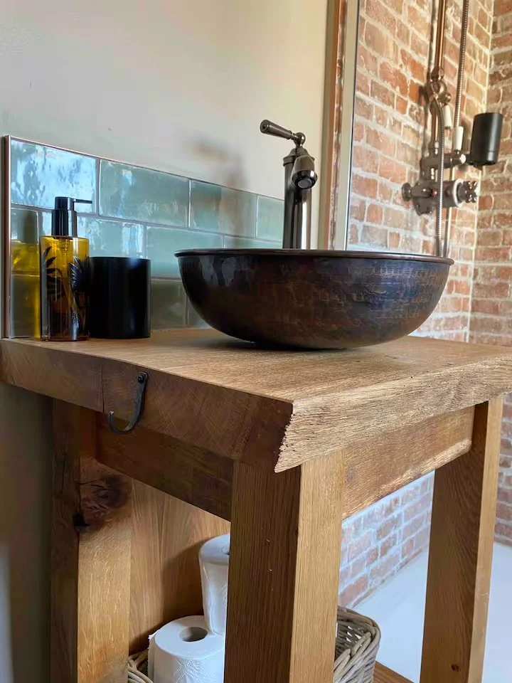 The bathroom has a rustic, contemporary feel with a large walk-in shower, copper basin, WC and heated towel rail.